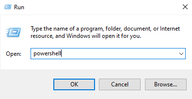 Runshould appear. Focus to the said window in theOpen:text field by hovering the mouse towards the said text field and left-clicking the mouse and typepowershellas shown below: